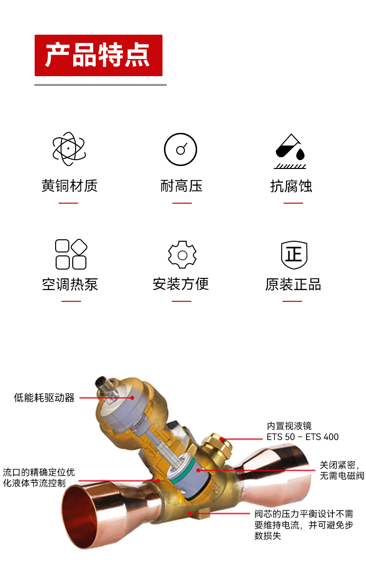 ETS系列電子膨脹閥用于空調和制冷系統中,精確控制向蒸發器的供液量。閥芯線性定位設計可實現充分平衡,不但能提供雙向流平衡,而且和電磁閥一樣,具有雙向關閉功能。