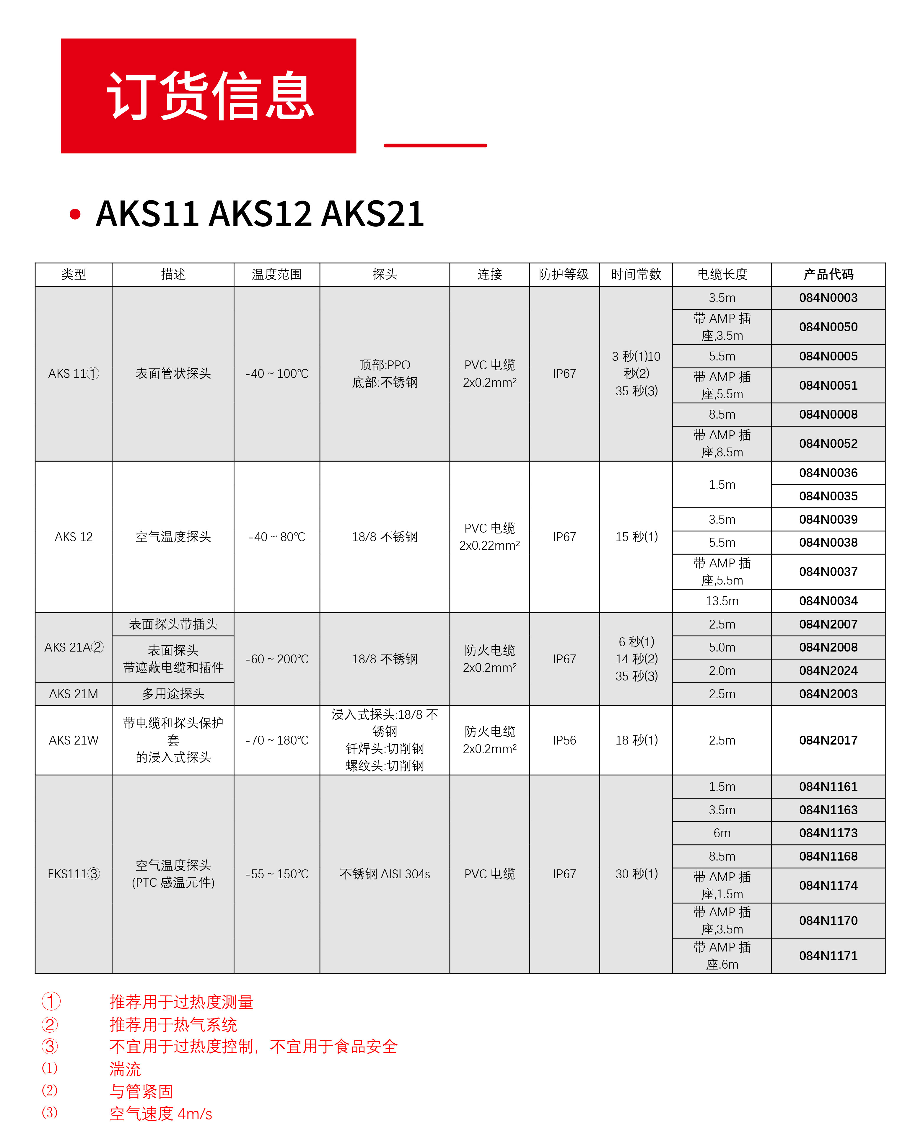 AKS 11, AKS 12, AKS 13 AKS 溫度探頭帶鉑金感溫元件,其電阻隨溫度成比例變化; Pt1000 的探頭在 0℃時的電阻為 1000Ω; EKS 111 探頭帶 PTC 感溫元件,在 25℃時的電阻為 1000Ω。 AKS 傳感器具有高精度與高穩定性,尤其在配合電子膨脹閥使用時可以精確測量過熱度,保證控制精度滿足要求。